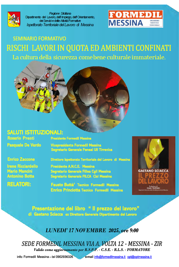 Si è tenuto presso la sede dell’Ance Messina, il seminario formativo “Rischi lavori in quota ed ambienti confinati”, organizzato dall’ispettorato territoriale del lavoro e da Formedil Messina