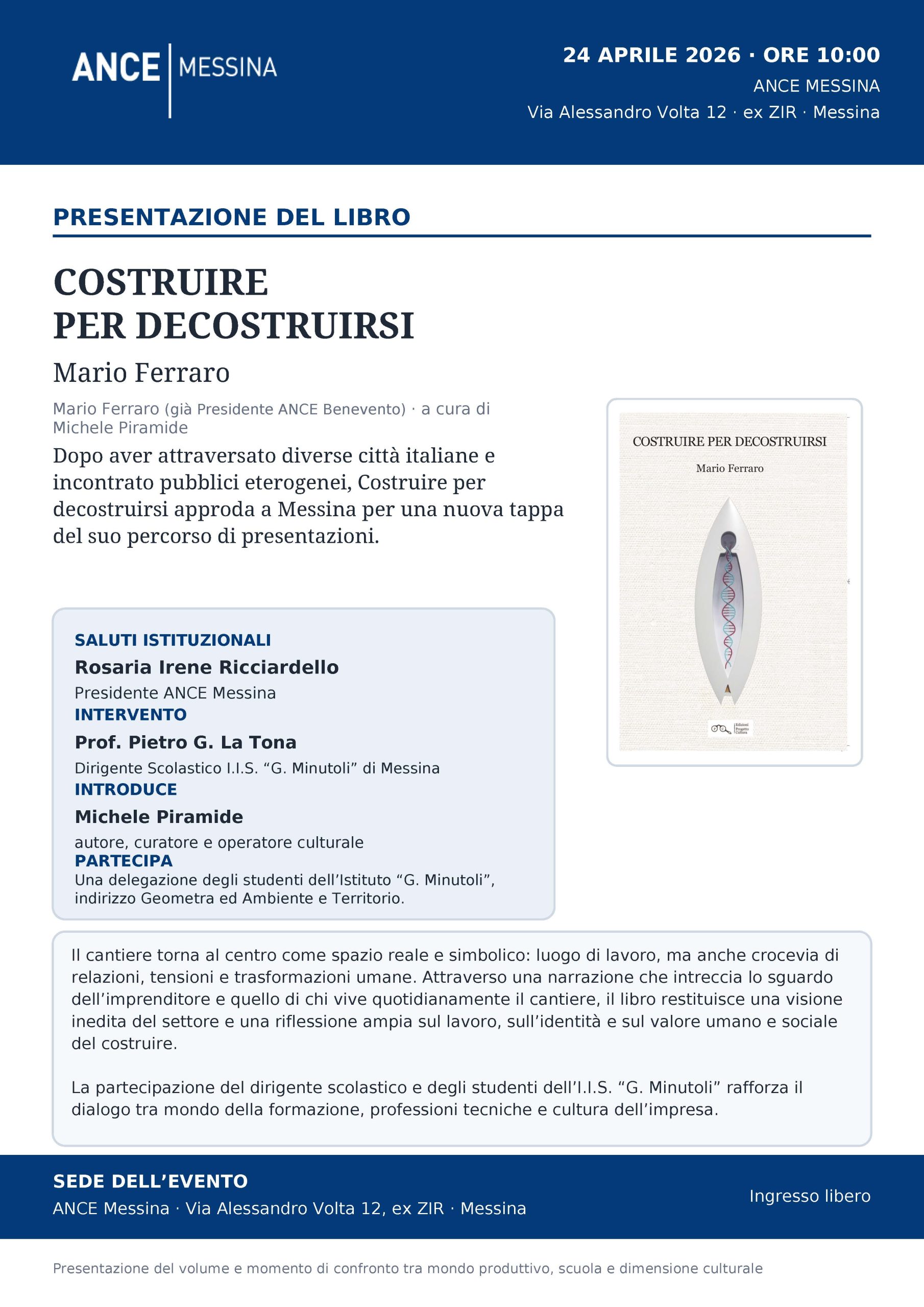 L’incontro si terrà il 24 aprile 2026 alle ore 10:00 presso ANCE Messina, in Via Alessandro Volta 12, ex ZIR, Messina, riportando il libro all’interno di una dimensione particolarmente significativa: quella del mondo edilizio, da cui trae origine e ispirazione.